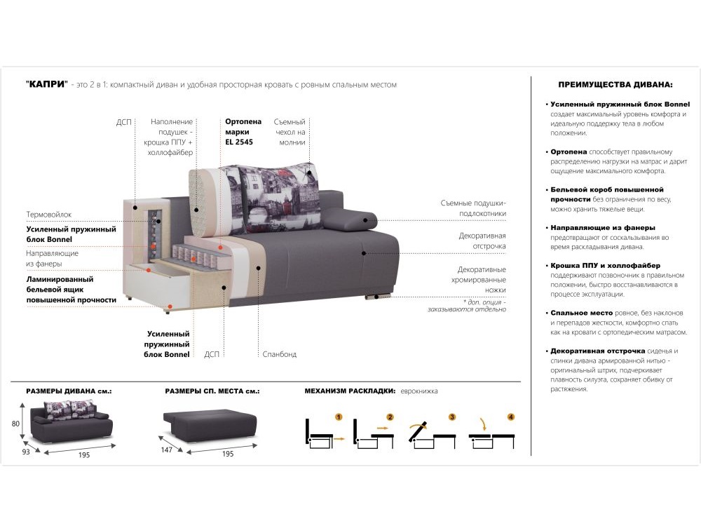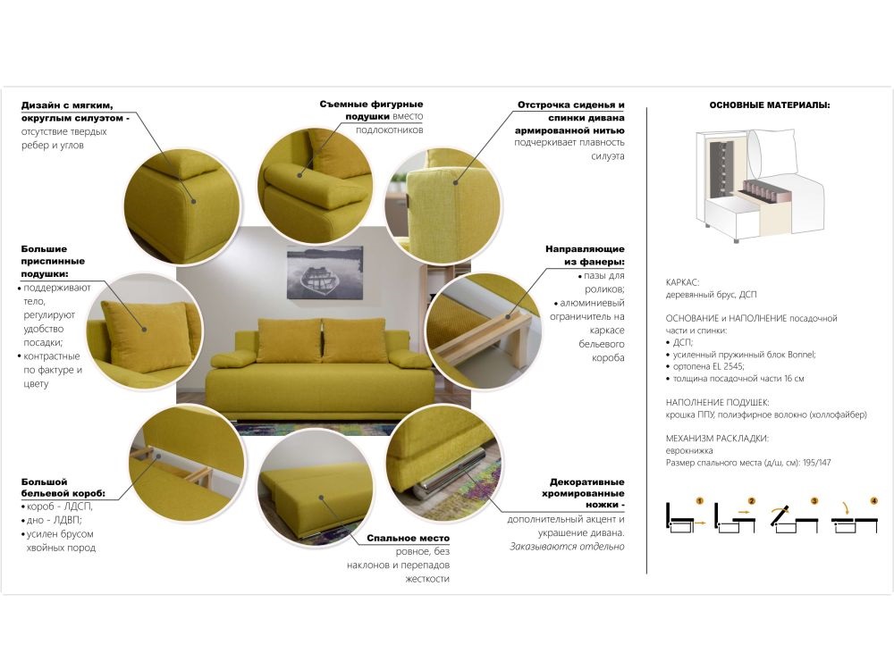 Две большие приспинные подушки со съемным чехлом на молнии обеспечивают поддержку тела в любом положении. Наполнение: крошка ППУ, полиэфирное волокно (холлофайбер).